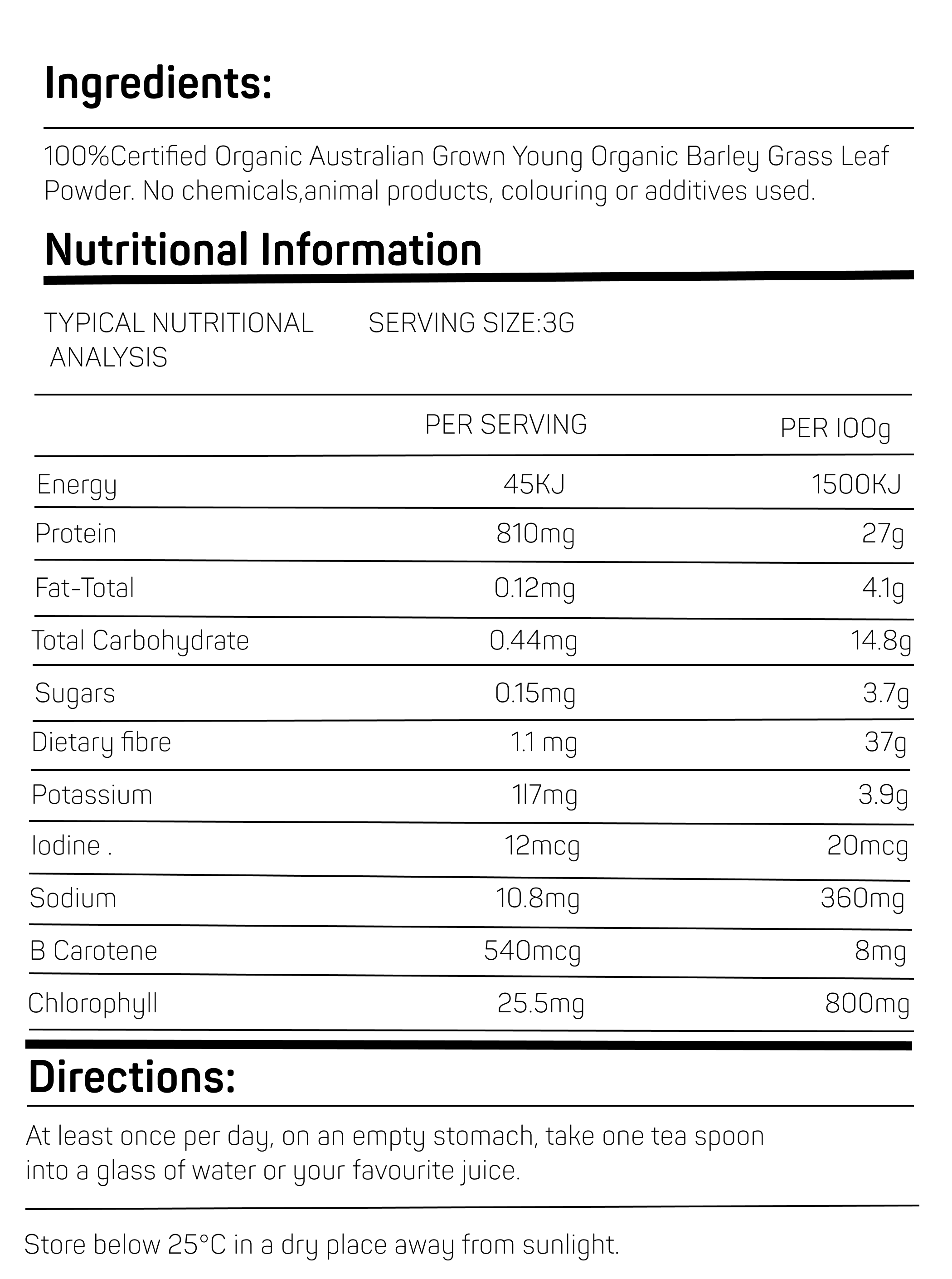 Unlike juiced barleygrass, which requires chemical additives to preserve its shelf life, our whole-leaf barleygrass is carefully dried at low temperatures to retain maximum nutrient potency and natural fibre content. This ensures that every serving delivers the complete nutritional benefits without compromise.