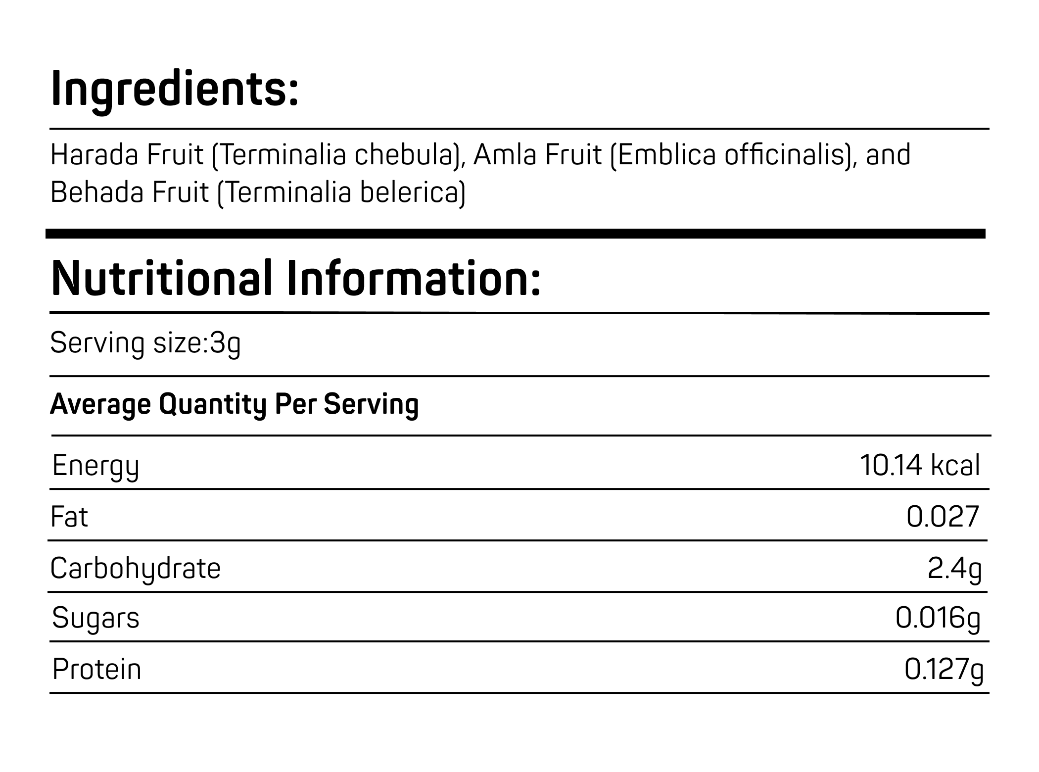 Bulk Super Foods Organic Triphala is made from three organic dried fruits - Amla (Emblica officinalis), Harada (Terminalia chebula), and Behada (Terminalia bellirica). The combination of these components working together is said to be more effective than if taken separately. Bulk Super Foods Triphala Powder is free from artificial sweeteners and other harmful additives.